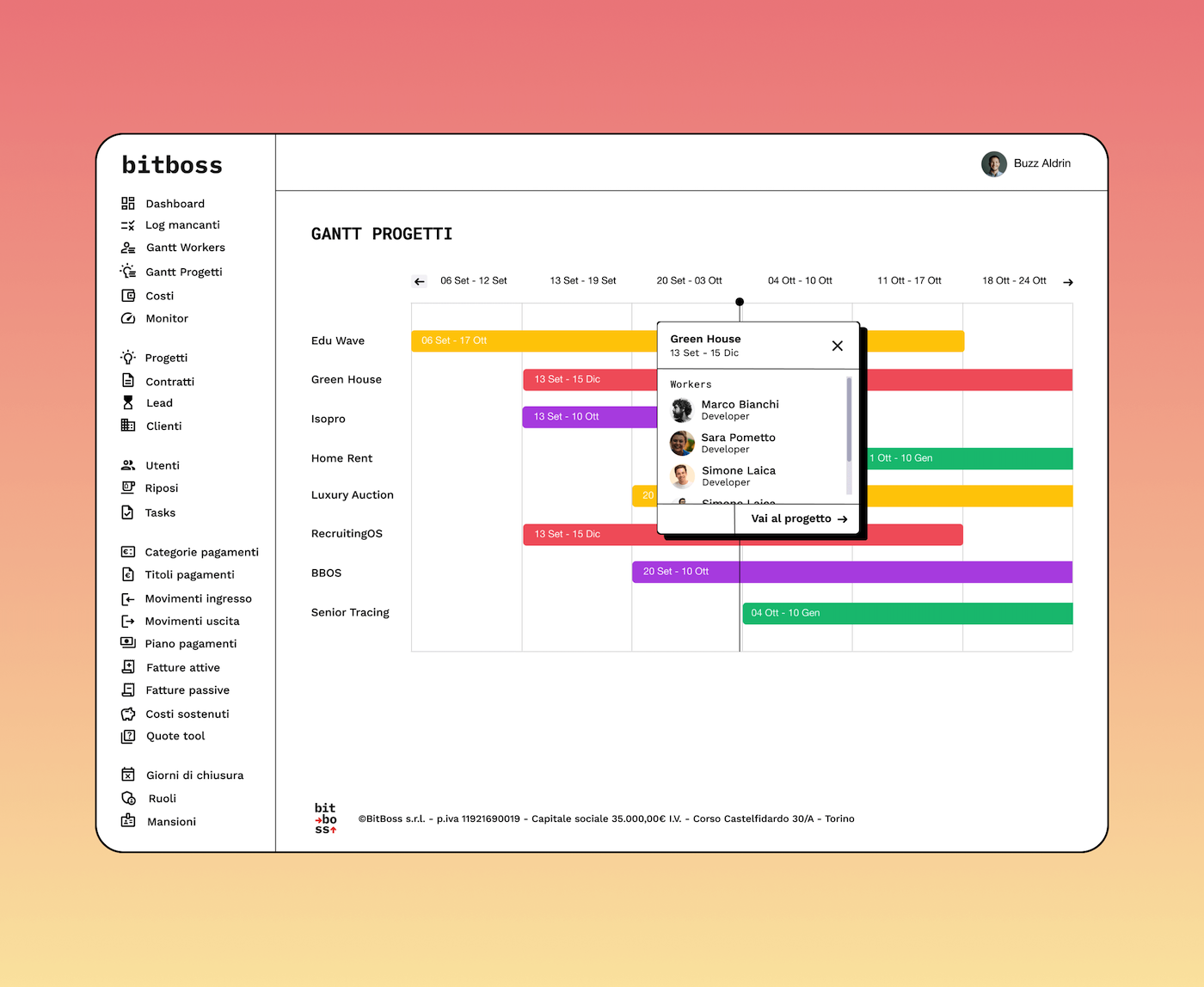 BBOS è il software che usiamo internamente per il controllo di alto livello dell’operatività aziendale. Ci permette di tenere traccia delle ore dedicate ad ogni singolo progetto, di allocare le risorse e sapere in ogni momento qual è il carico lavorativo di ogni persona del nostro team.