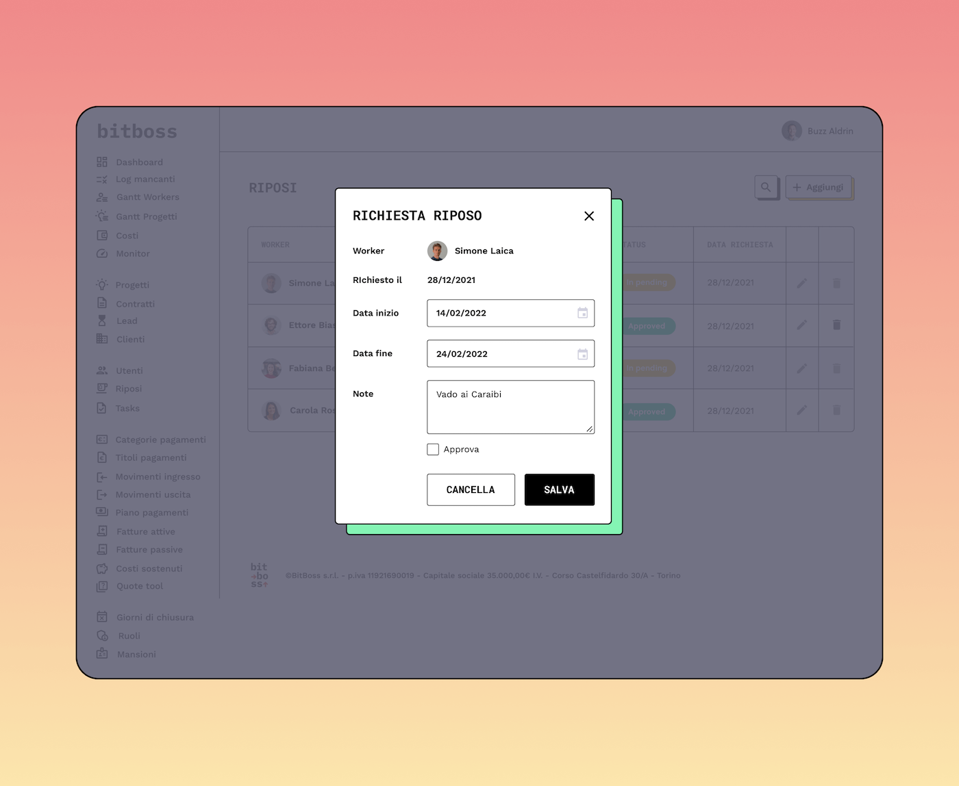 • Può gestire e approvare le richieste di riposi e permessi da parte dei Worker